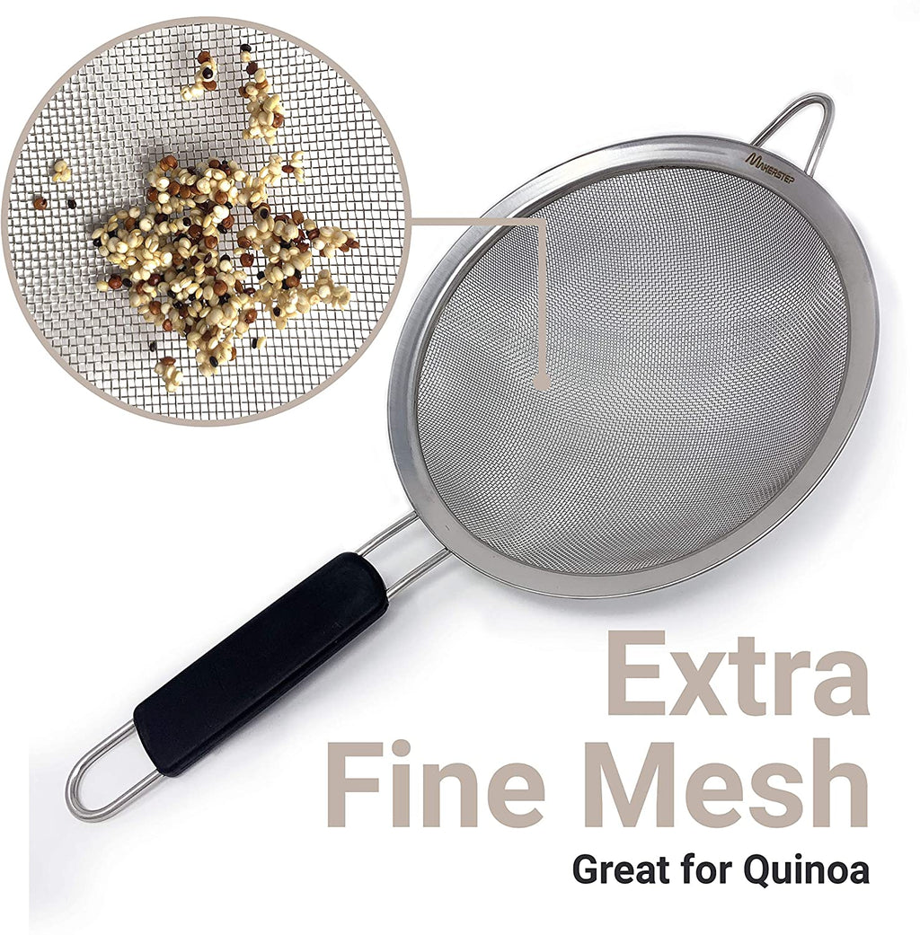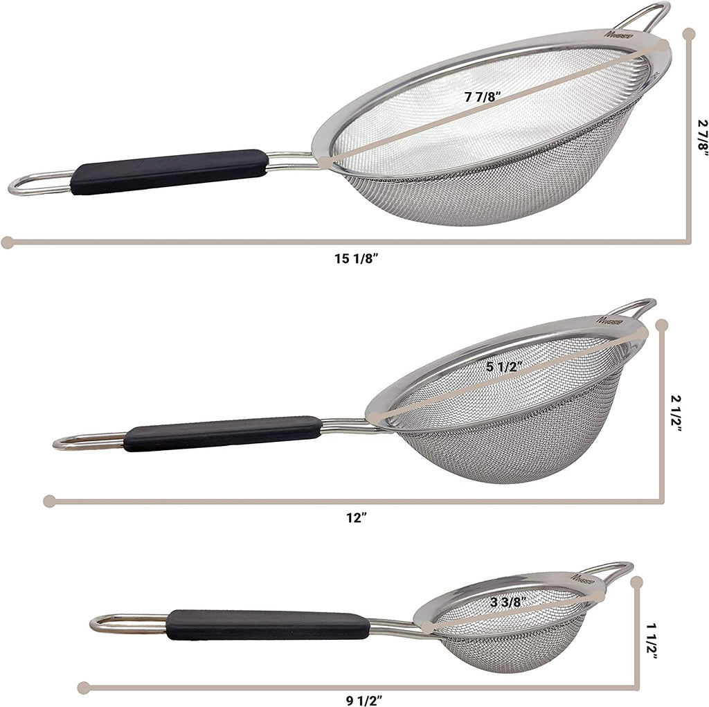 3 fine mesh strainers set of the sizes: 3 3/8", 5 1/2", and 7 7/8" strainer. Get these ultimate wire sift sieves to complete your Home and Kitchen Essentials collection