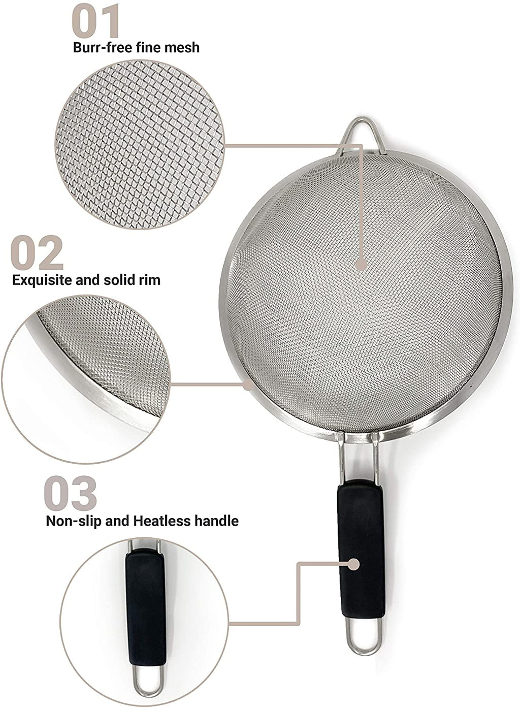 -High-Quality stainless-steel fine wire that will not rust or corrode. Easy cleaning. Dishwasher safe and can handle boiling liquids when straining pasta or hot vegetables.