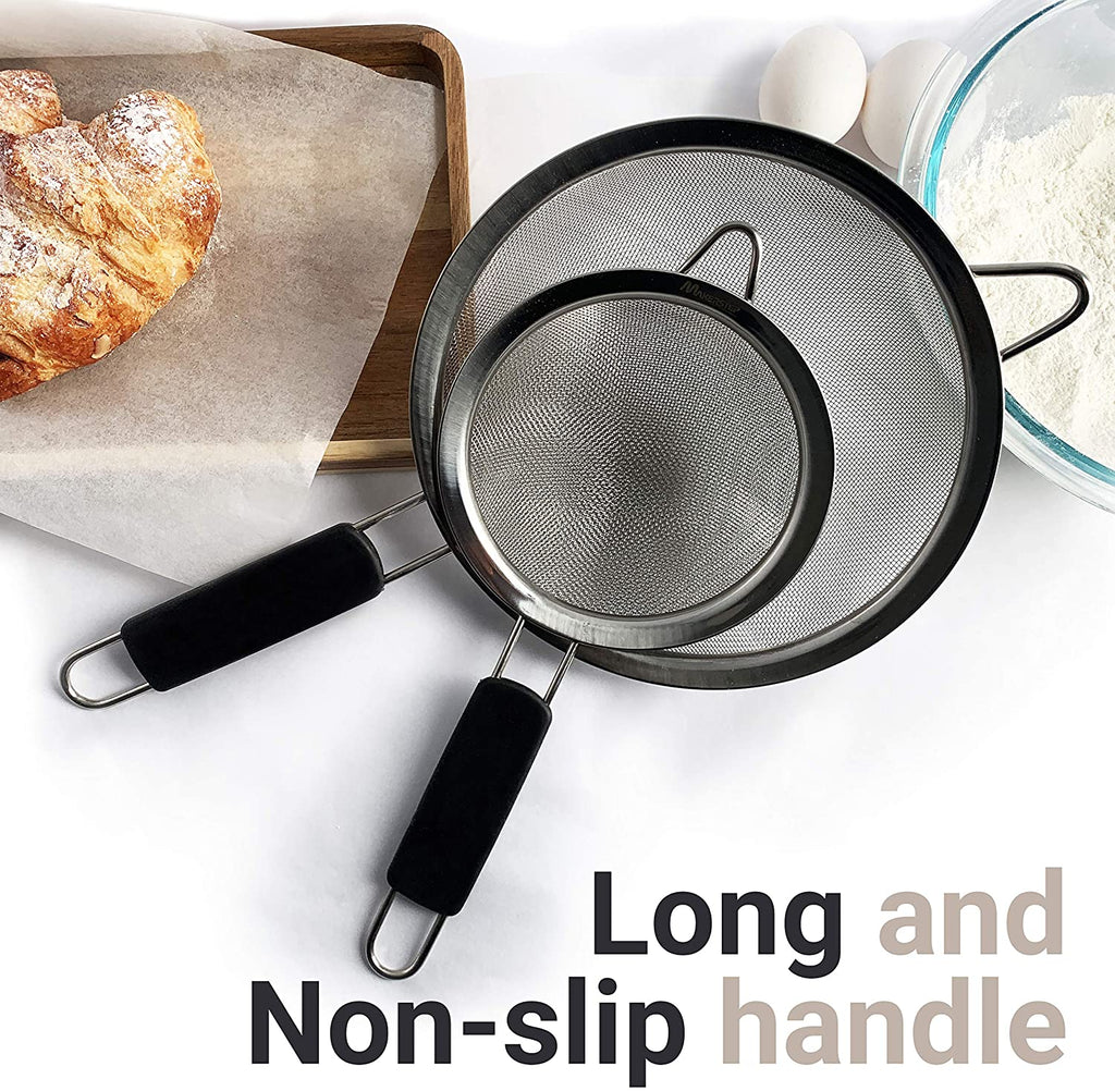 -Black insulate non-slip handles let you easily strain hot liquids and foods without burning your hand or fingers. The handles are ergonomic and feel comfortable even for long periods of use